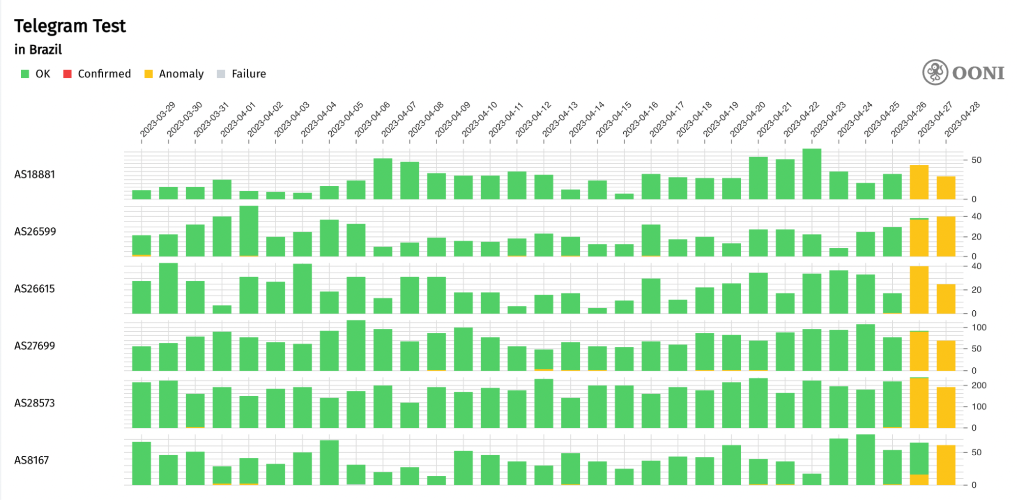 The above chart aggregates OONI Telegram measurement coverage from 378 ASNs in Brazil between 29th March 2023 to 28th April 2023. Successful Telegram measurements (indicating Telegram reachability) are annotated as “OK” (green), while measurements that present anomalies (signs of potential blocking) are annotated as “Anomaly” (orange).